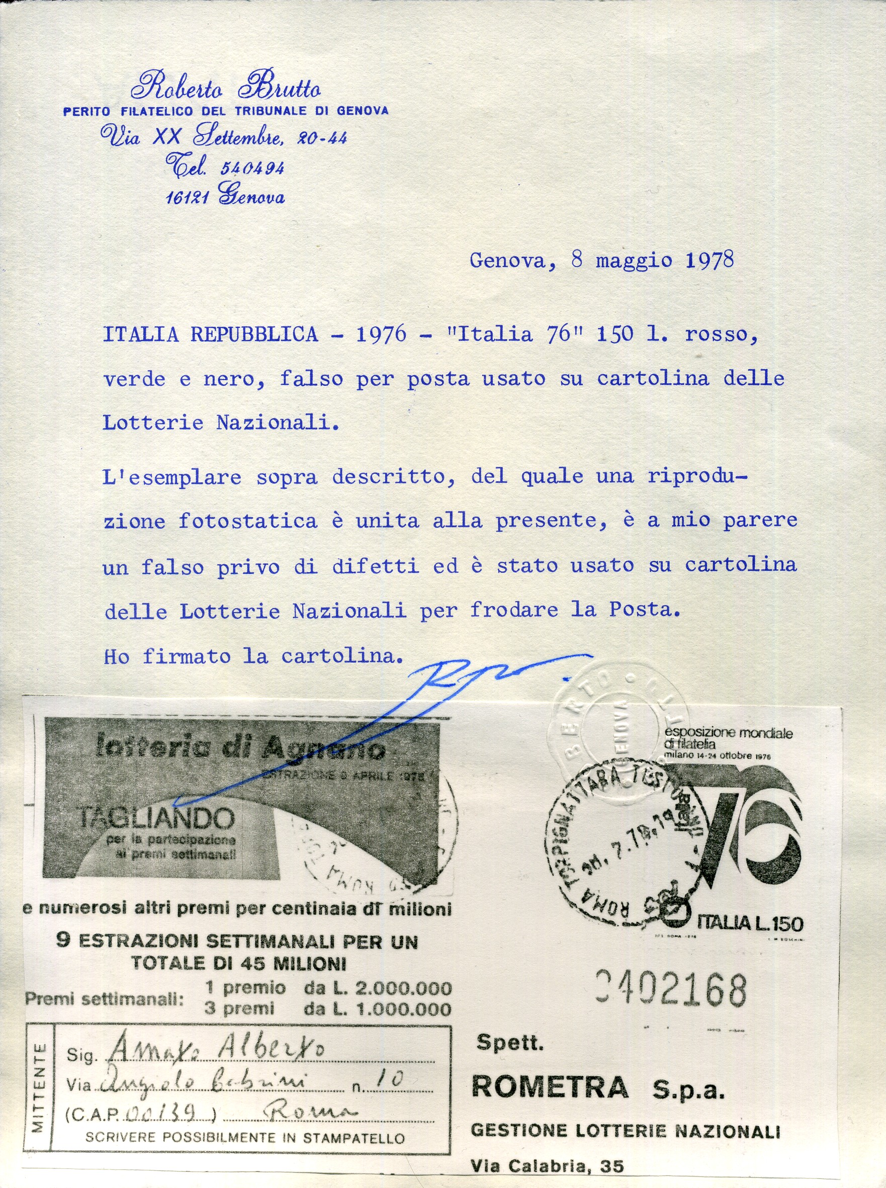 Geben die Preisnotierungen der italienischen Kataloge schon den Hinweis, dass diese Fälschung zum Schaden der Post relativ häufig ist, wird dies bei einem Blick auf das zu dieser Karte gehörende Zertifikat von Roberto Brutto - einem genuenser Händler und Prüfer.