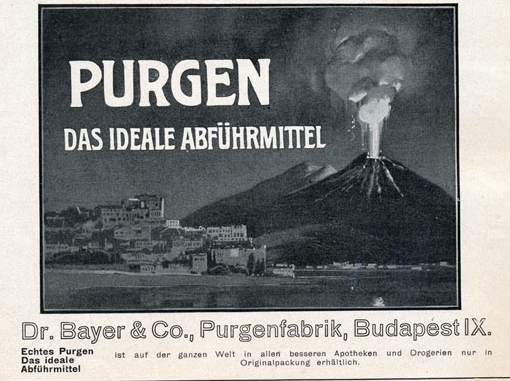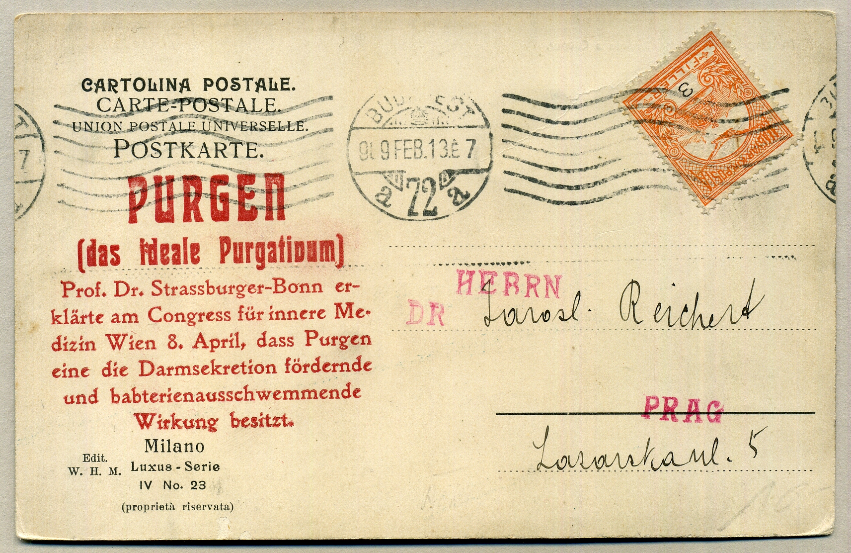 Aber wenn man die Karte umdreht fällt als Erstes eine ungarische 3-Filler Marke und ein Budapester Maschinenstempel auf. Und ein roter Zudruck: PURGEN (das ideale Purgativum) Prof. Dr. Strassburger-Bonn erklärte am Congress für innere Medizin Wien 8.April, dass Purgen eine die Darmsekretion fördernde und abkterienausschwemmende Wirkung besitzt.