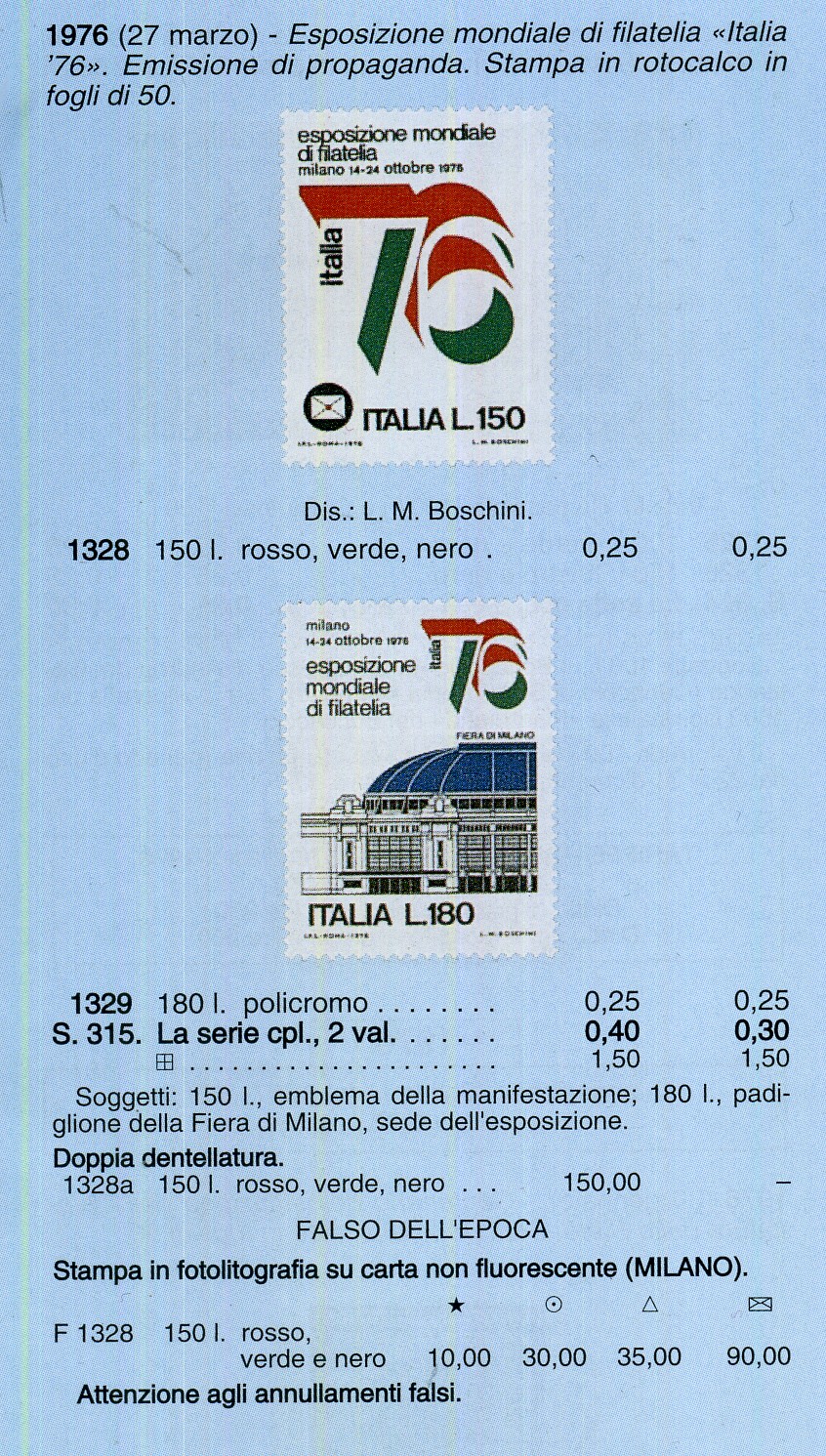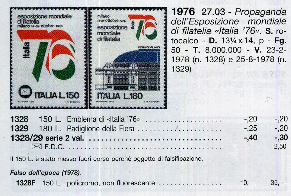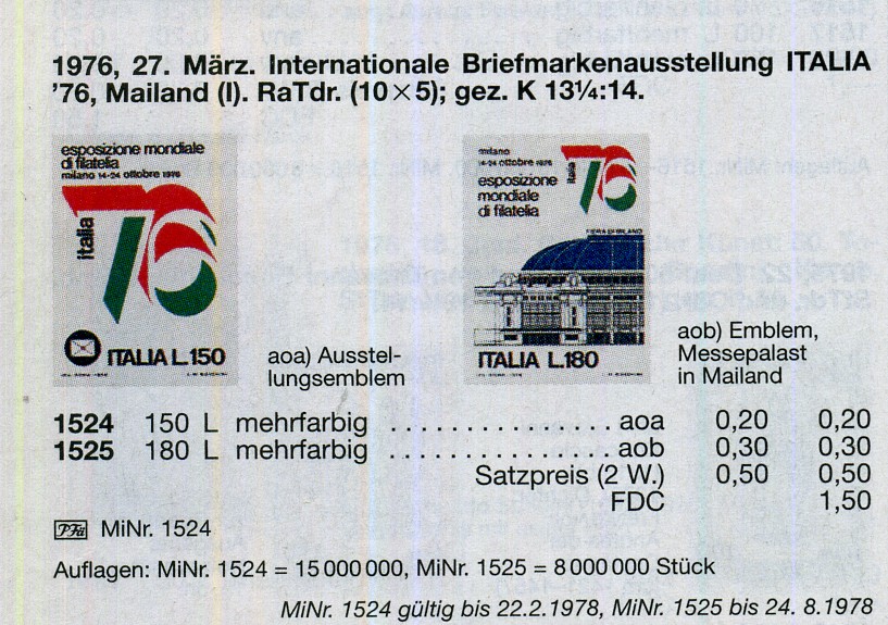 Im Oktober 1976 fand in Mailand die Weltausstellung der Philatelie statt. Zu dieser Veranstaltung gab die italienische Post zwei Markenserien mit insgesamt 7 Briefmarken heraus. Im März 1976 - also gutes halbes Jahr vor der Veranstaltung - erschienen zwei Marken: eine Marke zu 150 Lire, welche das Logo der Ausstellung zeigt, sowie eine Marke zu 180 Lire, welche neben dem Veranstaltungslogo auch den Messepalast als Veranstaltungsort zeigt.