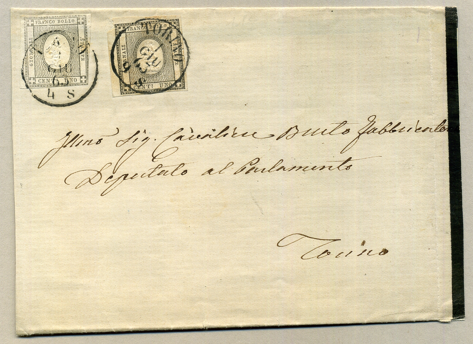 Zum Abschluß noch einige Takte zum Beleg selbst: 1C Ziffern 1861, zwei Werte in unterschiedlichen Tönungen, beide berührt, jeweils mit K1 TORINO / 1 GIU 63 auf Trauer-Drucksache im Ortsverkehr. An dieser Beschreibung von Wolfgang Lang ist nichts auszusetzen. Statt Tönungen hätte ich vermutlich das Wort Farben oder Farbtönungen genommen und die Beschreibung in englisch oder italienisch gemacht, und eventuell auf die leichte "tropische Trönung" der Marken hingewiesen. Dass der Briefbogen in zwei Teilen vorliegt, hat sicherlich dazu geführt, dass der Spender dieses Beleges nicht den vollen Preis ansetzen konnte: denn wir haben hier tatsächlich zwei Farben dieser Marke vorliegen, und wenn ich nur die beiden preiswertesten Sassone-Notierungen - die für grauschwarz und schwarz ansetze, liege ich bei über 400 € Katalogwert.